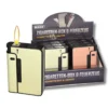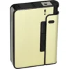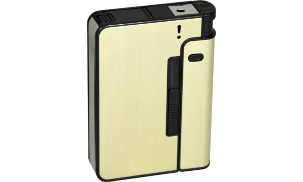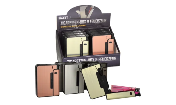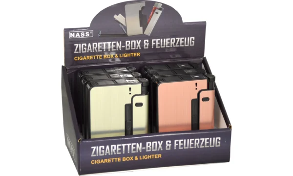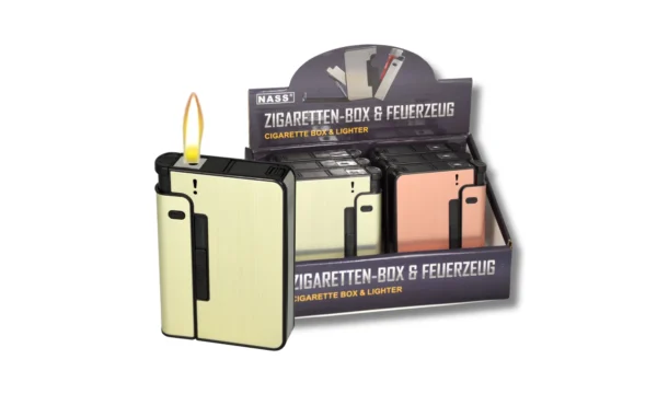 2in1 Zigarettenbox mit Feuerzeug – Die praktische Box für Raucher. Über eine elegante Schiebe-Mechanik werden die Zigaretten entnommen. In der Zigarettenbox ist ein Feuerzeug integriert, schiebt man den Hebel hoch springt eine Zigarette raus. Drückt man den Knopf oben nach unten, zündet das Feuerzeug.