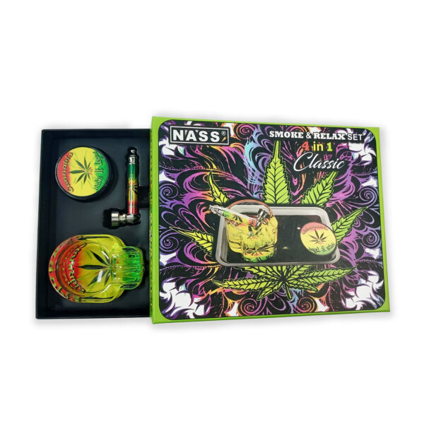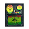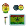 Das Smoke & Relax Set 4 in1 enthält alle wichtigen Zubehörteile für den täglichen Gebrauch. Im Set enthalten sind ein Zen Tray (Rolltablett), ein Grinder, ein Aschenbecher und eine Metallpfeife, jeweils im Rasta-Design mit Hanfblatt und dem Schriftzug “Make It Legal”.