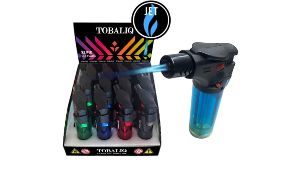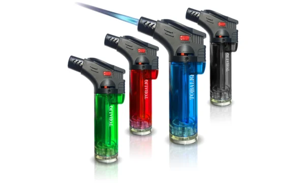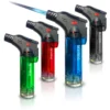 Großer, transparenter Brenner mit stabiler blauer Laserflamme. Erhältlich im 12er-Mix-Display in den Farben Blau, Schwarz, Rot und Grün. Mit Kindersicherung und nachfüllbar