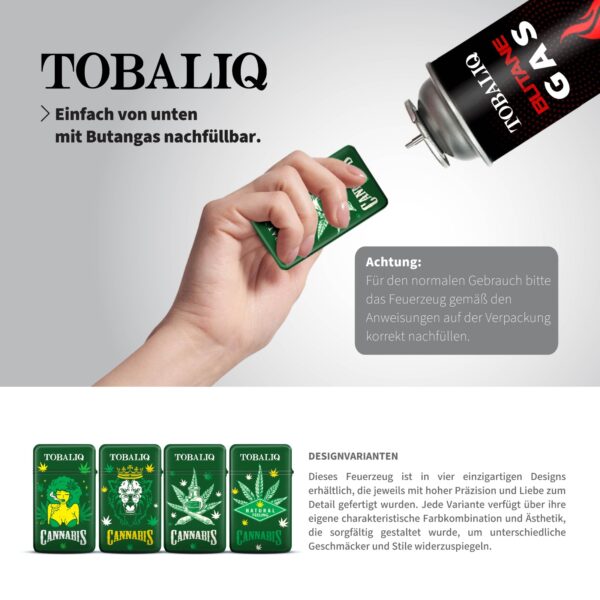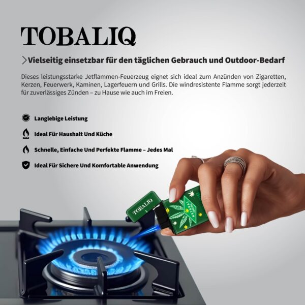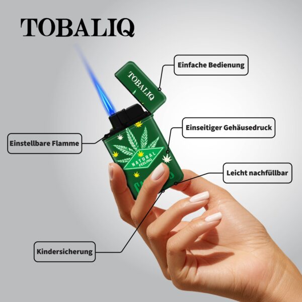 Stylisches Jet-Flame Feuerzeug im edlen CANNABIS -Design. Das Modell KING CANNABIS von Tobaliq überzeugt mit starker, windresistenter Flamme und robuster Verarbeitung. Geliefert im praktischen 20er Display – perfekt für Eigenbedarf, Weiterverkauf oder als edles Geschenk.