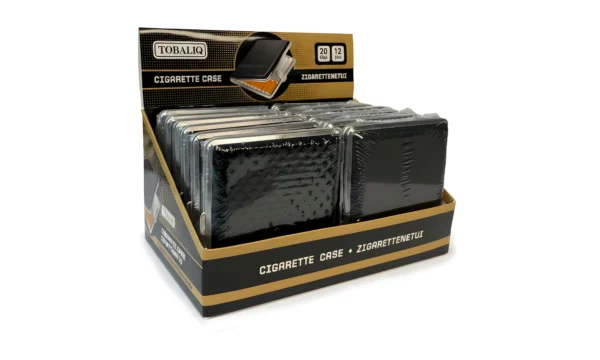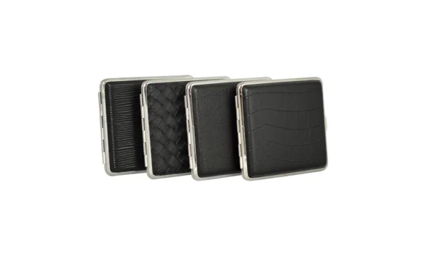 Dieses Etui ist in elegantem Schwarz erhältlich und verfügt über 4 unterschiedliche Oberflächenstrukturen, die für eine schicke Optik sorgen.Mit einer Kapazität für 20 normale Filterzigaretten bietet dieses Etui aus Metall und Kunstleder eine praktische und stilvolle Aufbewahrungslösung. Die Innenseite ist mit einem Gummiband ausgestattet, das verhindert, dass die Zigaretten herausfallen und sie sicher an ihrem Platz hält.